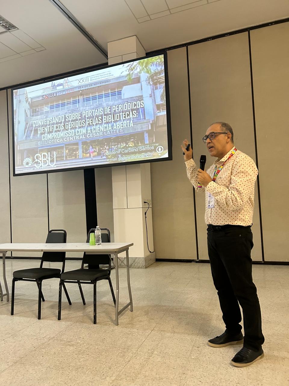 O bibliotecário Gildenir Carolino Santos, Gestor de Editoração Científica do SBU, também participou de uma mesa com o tema “Conversando sobre Portais de Periódicos Científicos geridos pelas Bibliotecas: compromisso com a Ciência Aberta”.