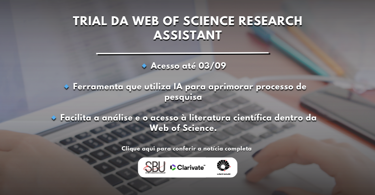 O SBU segue promovendo acesso à informação científica de qualidade. Como parte desse compromisso, informamos a abertura do período de trial gratuito do Web of Science Research Assistant, uma ferramenta de inteligência artificial generativa voltada ao apoio direto nas atividades de pesquisa acadêmica.
